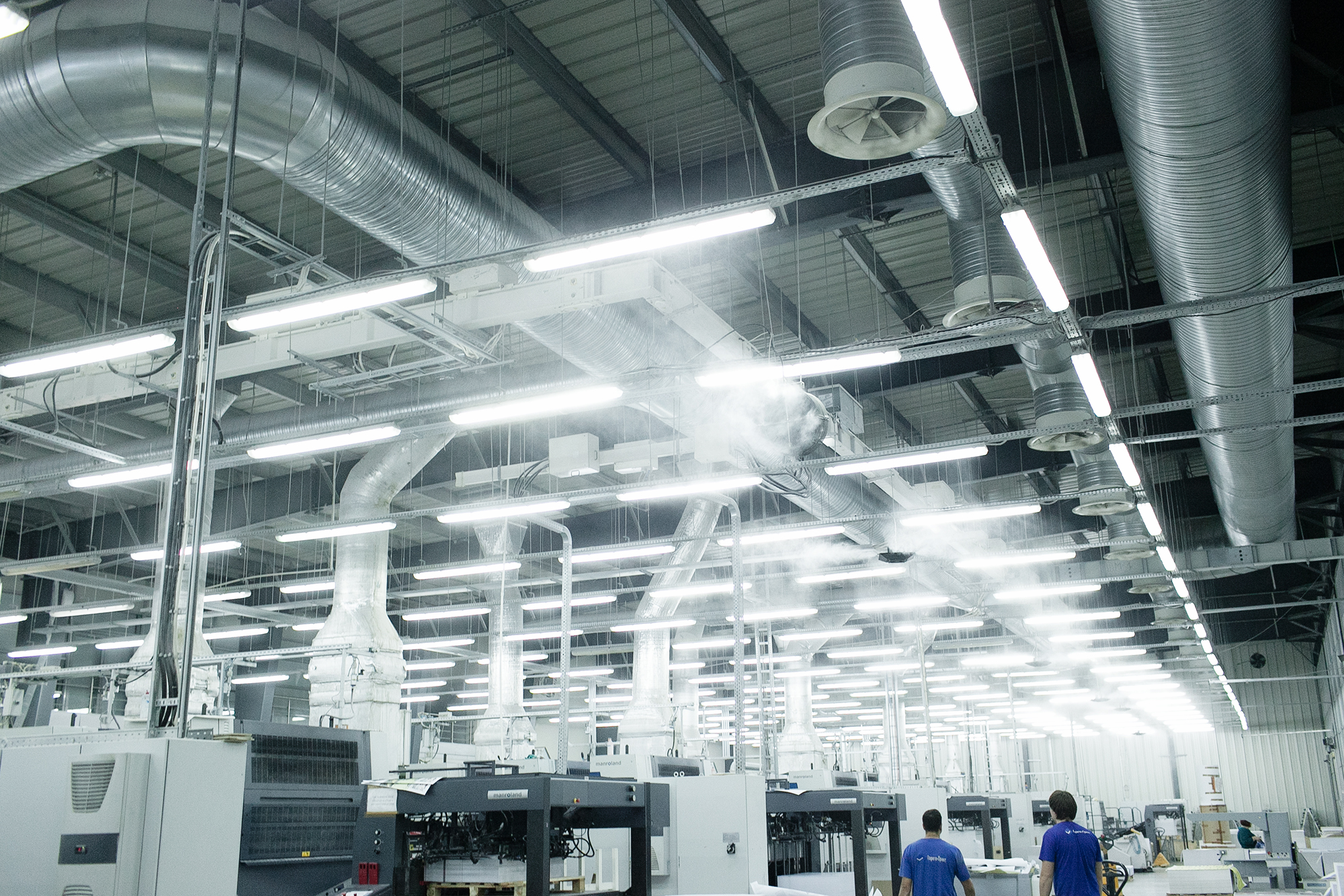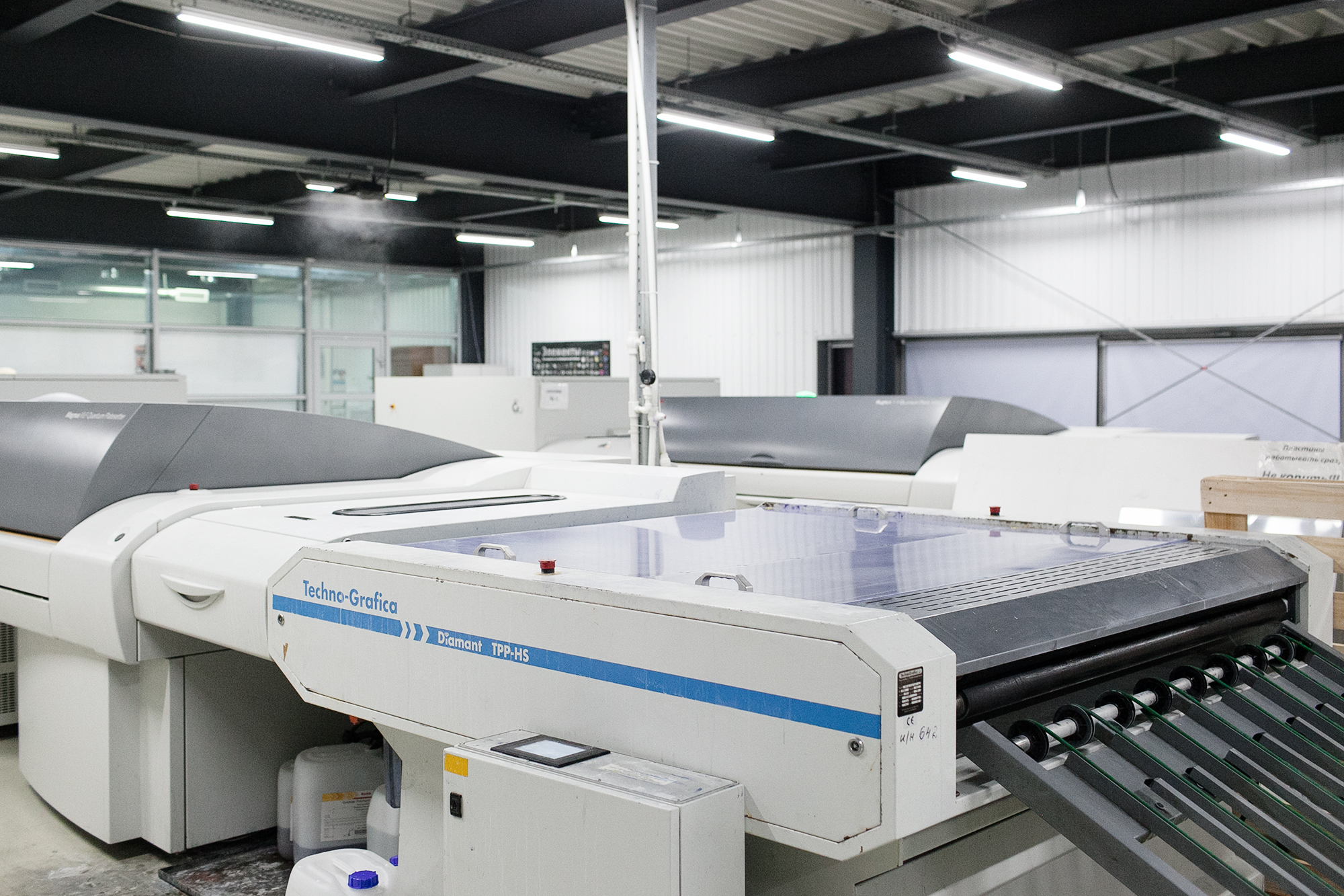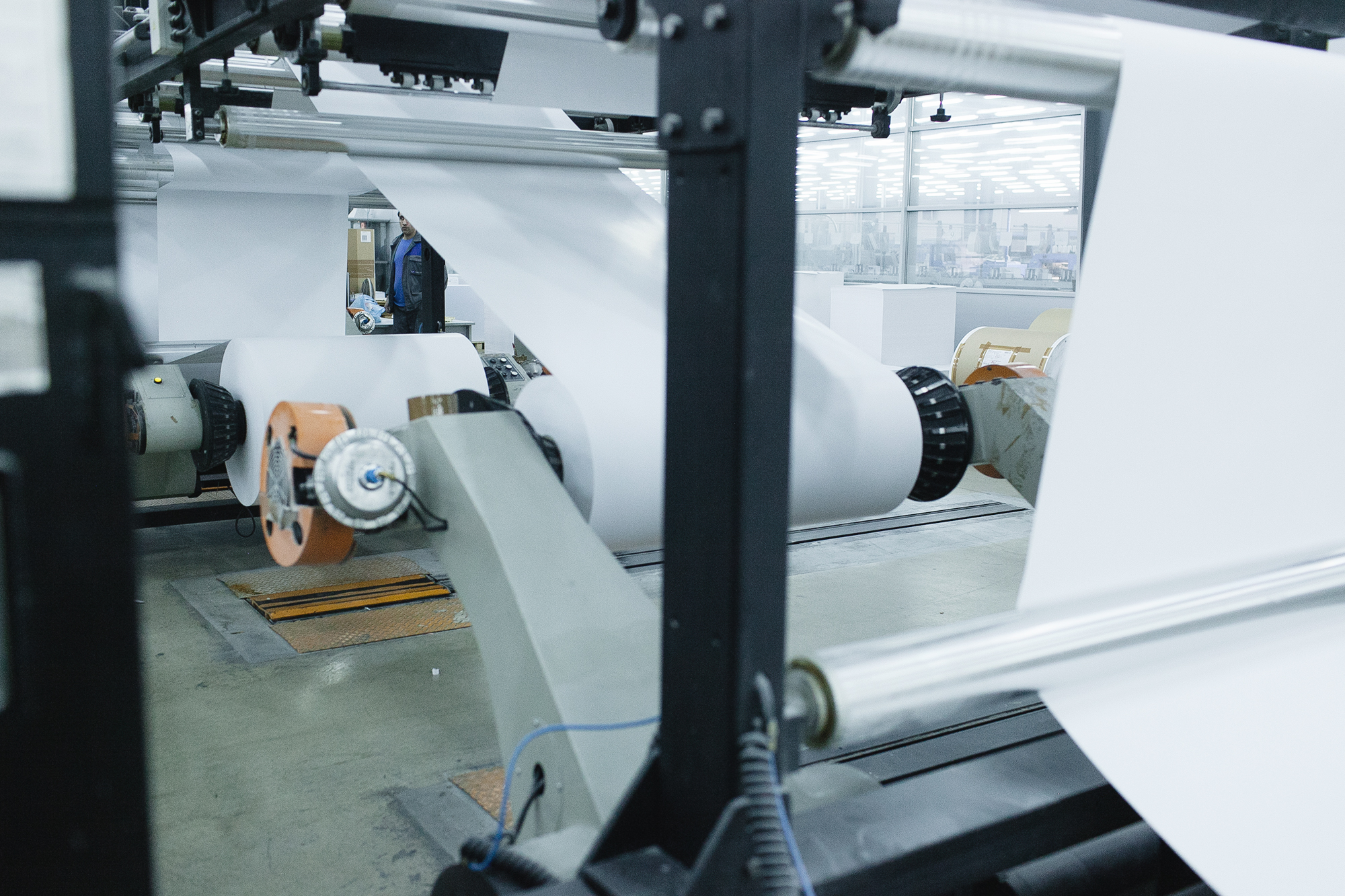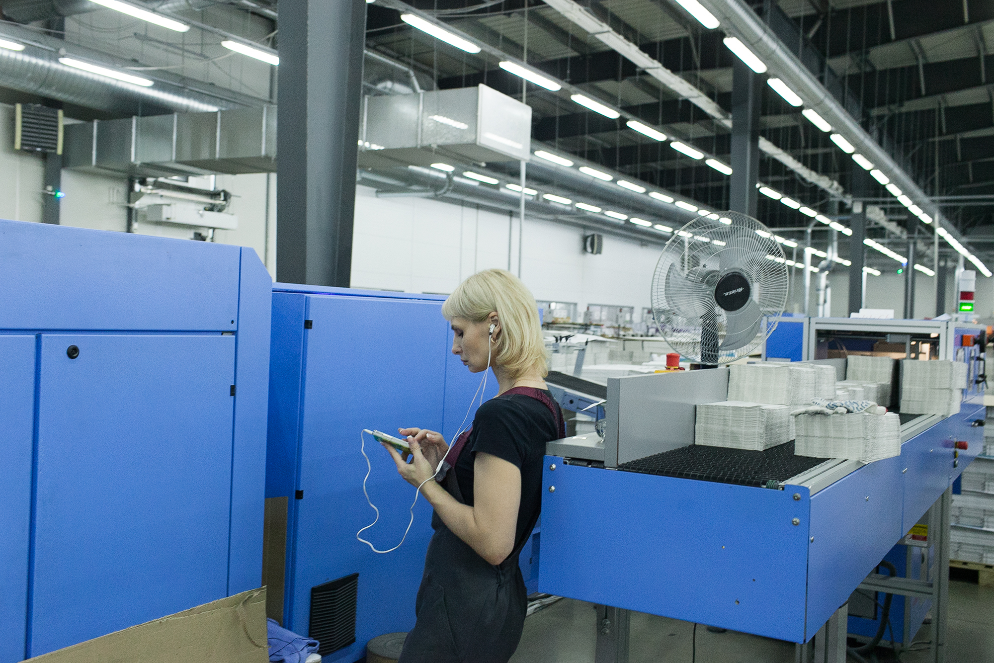 Фото: Андрей Заплатин Бумага будущей книги изначально подается в цех в «ролях» — рулонах диаметром и высотой около метра. Далее бумага флатуется, то есть режется на нужный формат листа во флаторезках — агрегатах, которые разматывают роль, нарезая листы нужного формата и в необходимом количестве. В зависимости от уровня влажности в помещении бумага может по-разному впитывать краску, а значит, по-разному вести себя при печати. И поэтому в печатном цехе поддерживается строгий температурно-влажностный режим — под потолком беспрестанно пышут водяным паром несколько десятков увлажняющих форсунок.