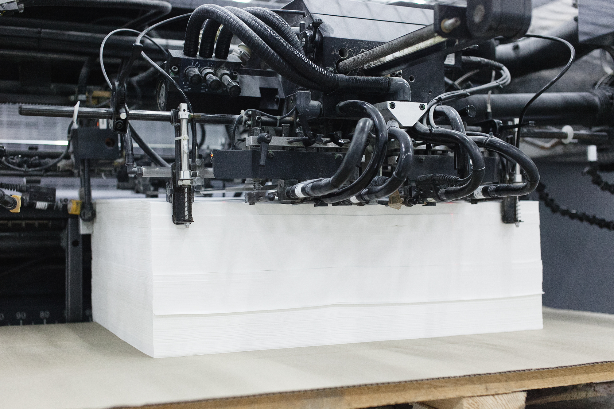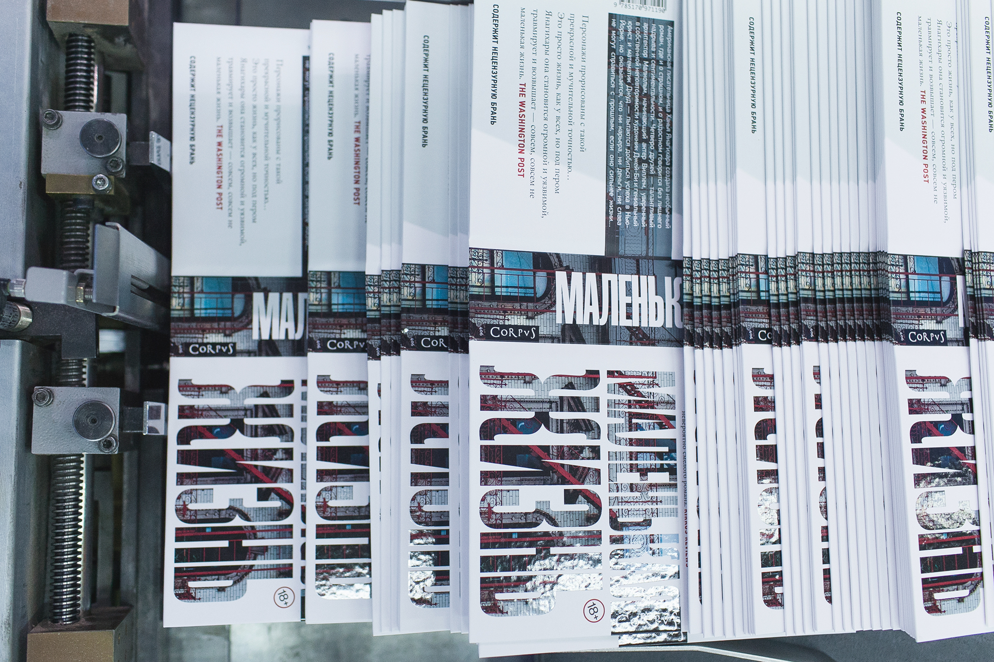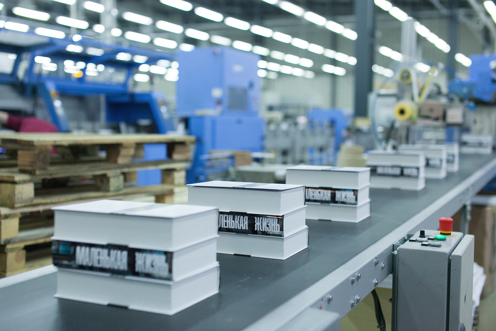 Фото: Андрей Заплатин Осталась финишная операция — накидка «крышки» (то есть обложки). «Крышка» приклеивается к блоку намертво, на ней формируется штриховка — такая «канавка» у самого корешка, которая позволяет книге лучше и легче открываться. Готовые книжки автоматически складываются в стопки в шахматном порядке (если сложить корешками в одну сторону, пачка распадется) и упаковываются. В конце линии пачки с книгами автоматически ложатся на паллеты и перемещаются на склад — ждать отправки в книжный магазин. Иногда книги ждут своего часа по несколько дней, но в случае с «Маленькой жизнью» Ханьи Янагихары все было иначе. Как только тираж был напечатан, за ним приехал автомобиль и увез в книжные магазины.