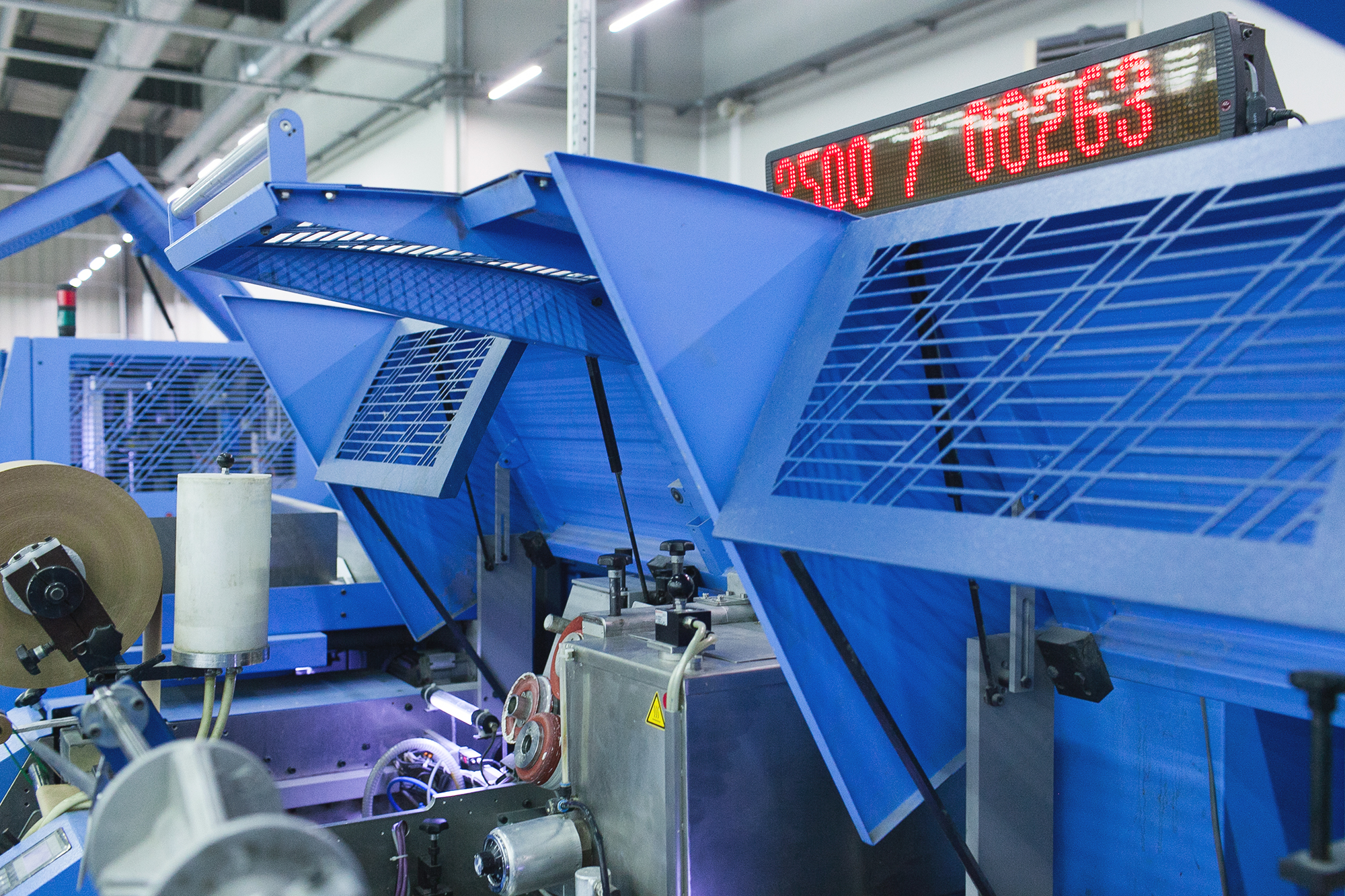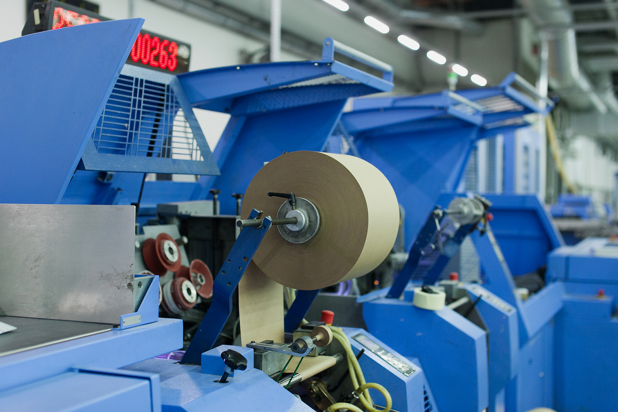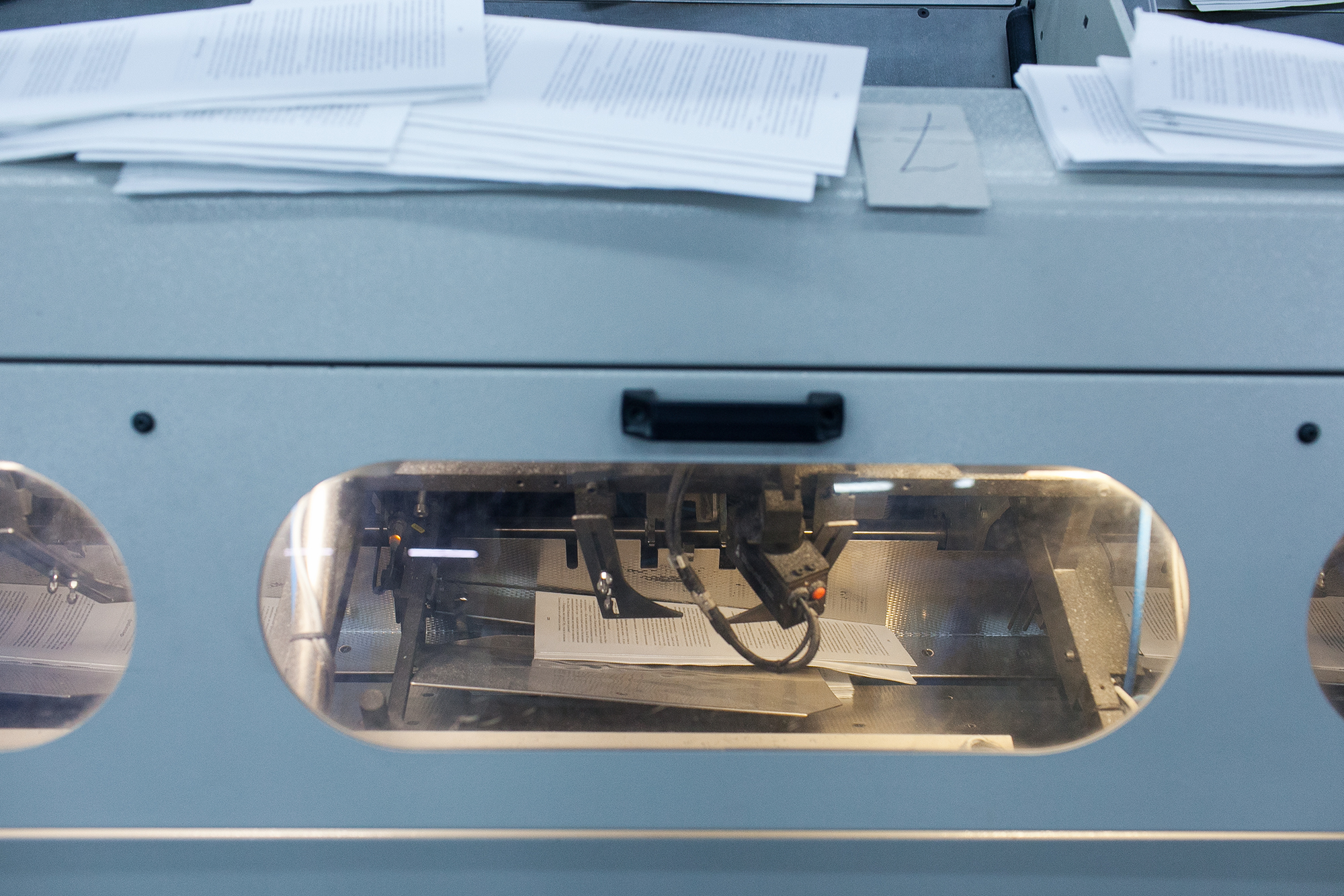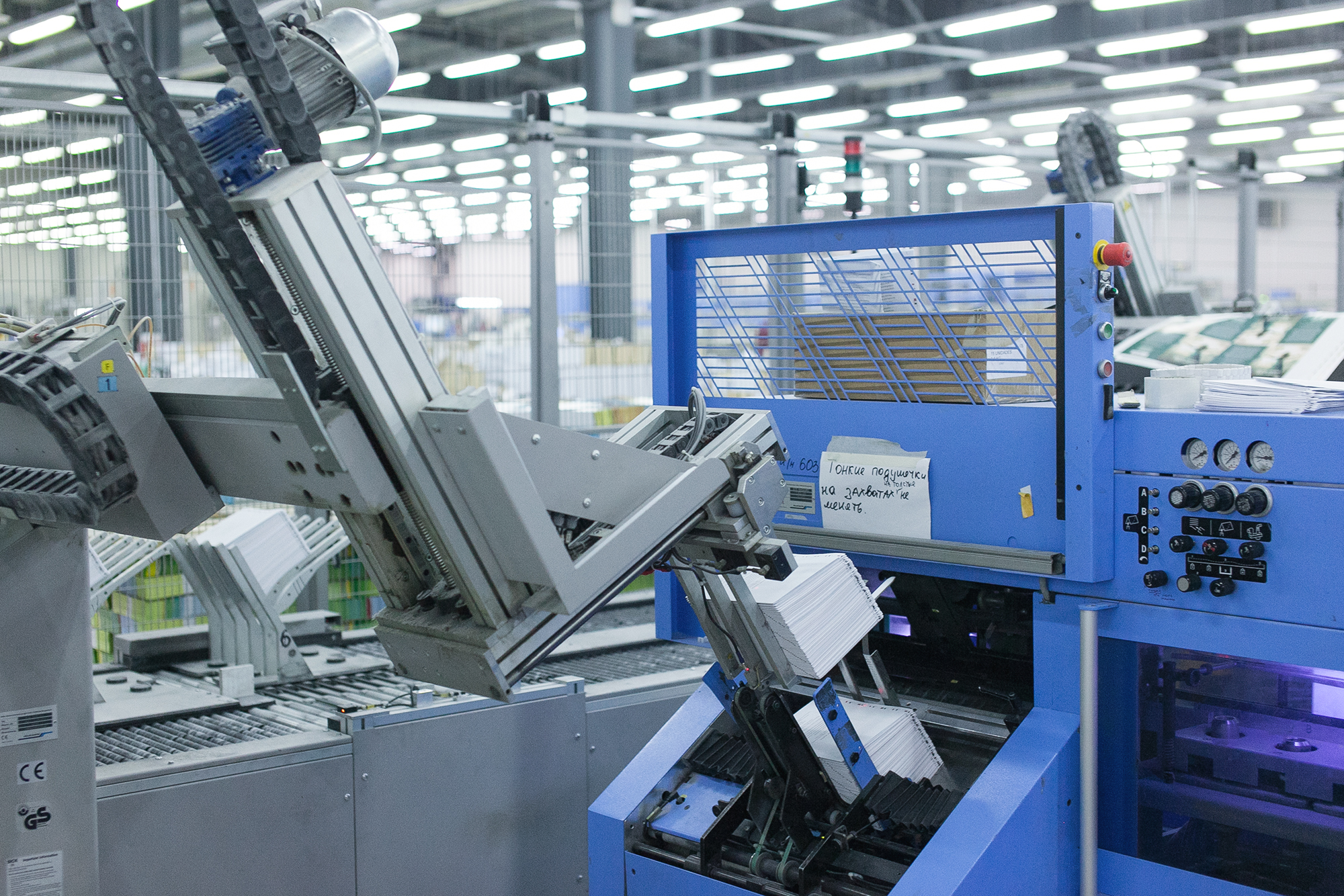 Из печатного цеха паллеты с листами отправляются в соседний переплетно-брошюровочный цех (его называют ПБЦ). Там происходит так называемая фальцовка, или складывание листов в тетрадки по 32 страницы с необрезанными краями. Человек в этом процессе не участвует — все автоматизировано.