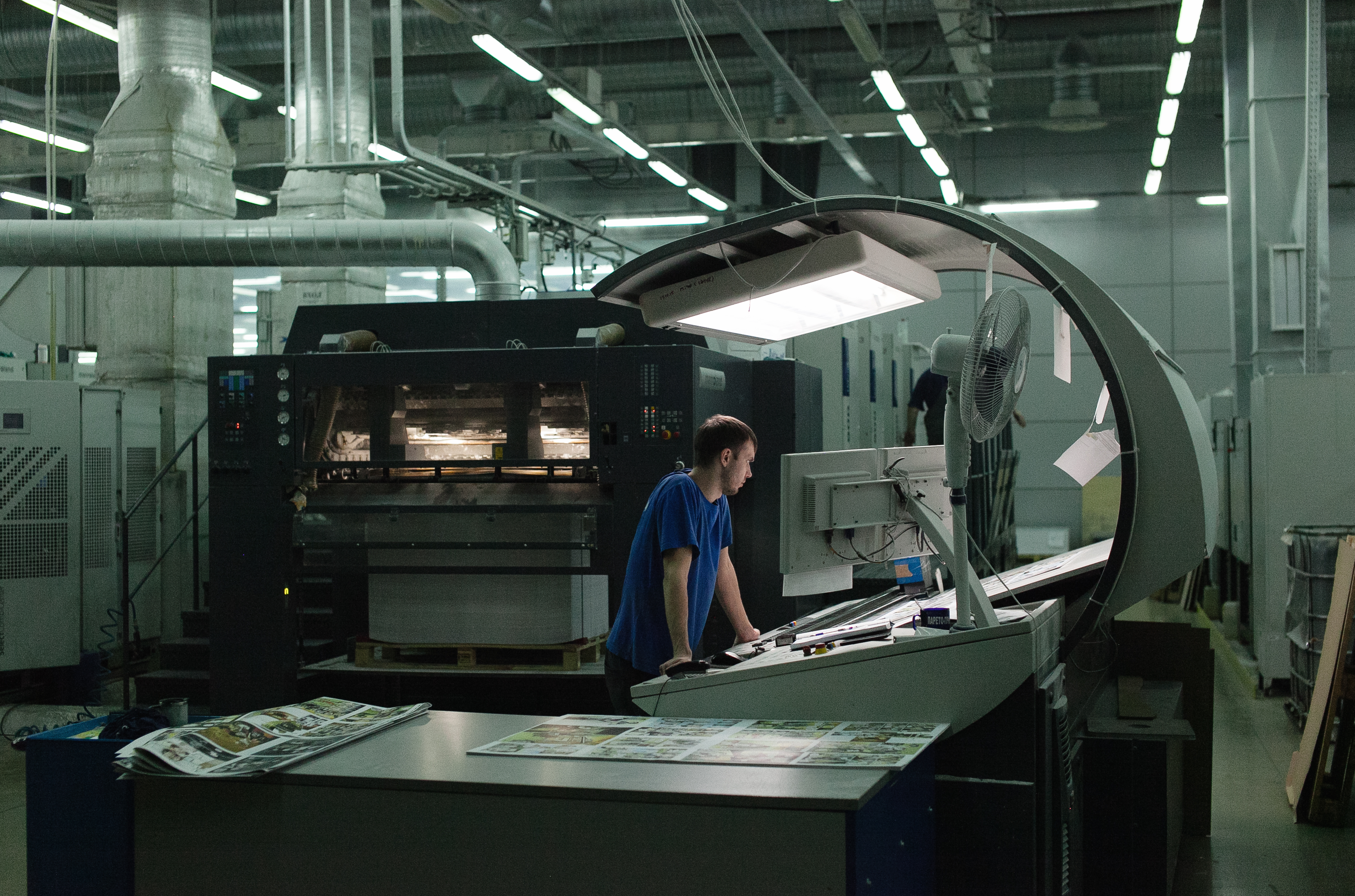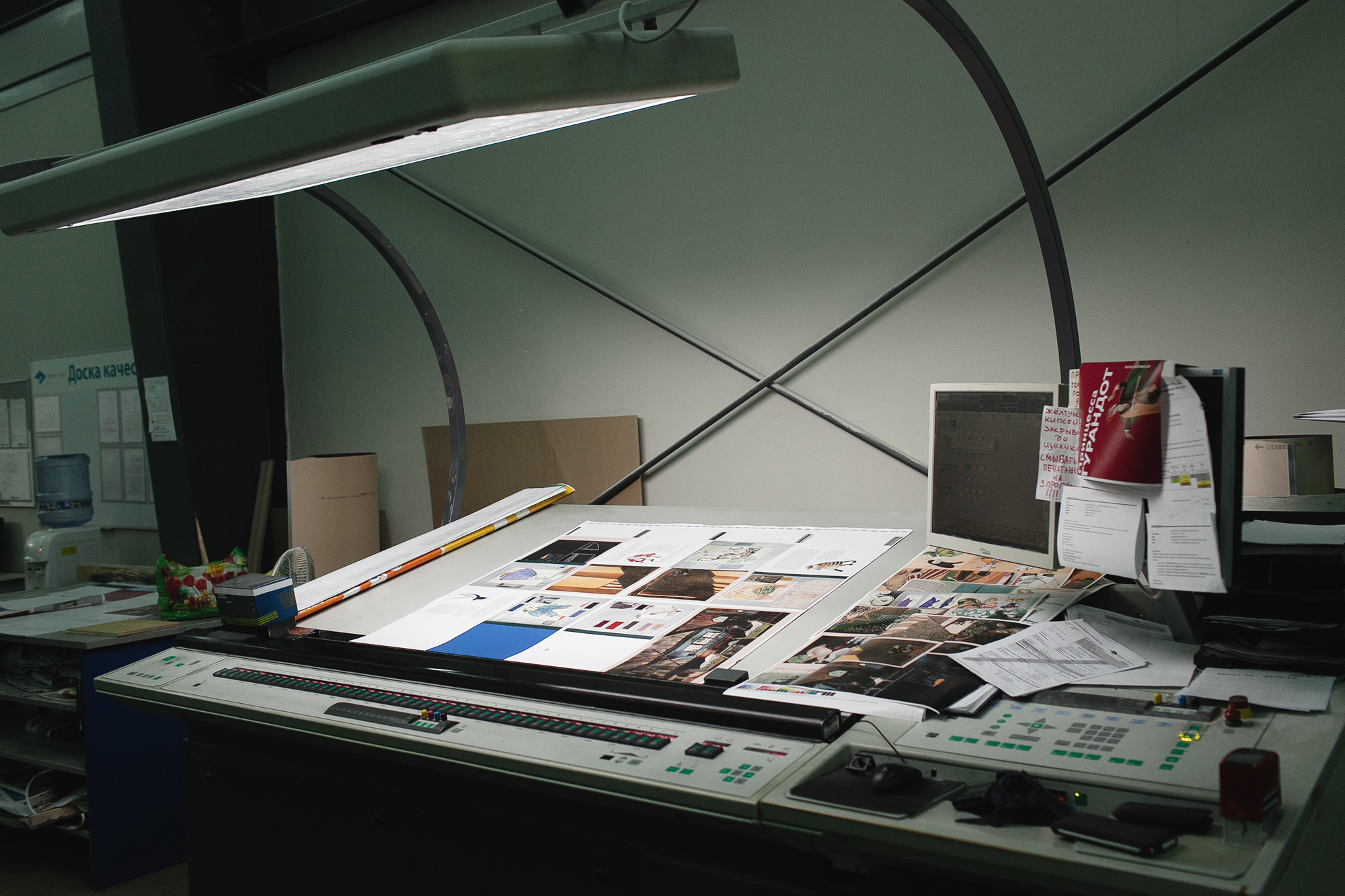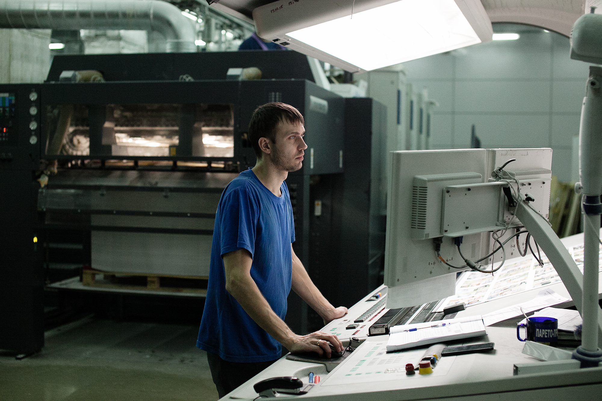 Фото: Андрей Заплатин Далее наступает момент истины — собственно, печать. В современных типографиях процесс этот полностью автоматизирован — за каждой печатной машиной, по габаритам напоминающей ЭВМ 1960-х годов, стоят всего два человека: печатник и его помощник. В мире полиграфии печатники — это элита. Причем почти исключительно мужская. «Печатник-женщина? — переспрашивают в типографии. — Есть, но только одна». Стол мастера по печати похож на пульт в телевизионной студии — несколько рядов кнопок и рычажков. Важная часть работы печатника — верно передать цвет иллюстраций, так, как это задумал заказчик. В этом помогают ценнейшие в типографии машины — денситометры, которыми оснащены все рабочие столы офсетных печатных машин.