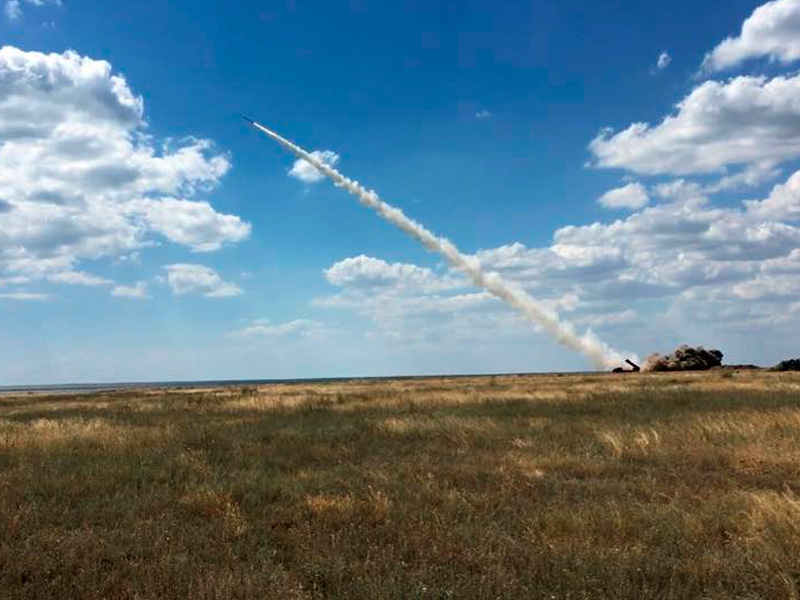 Пуск ракеты на стрельбах. Украина успешно провела пуски ракет в своем воздушном пространстве в акватории Черного моря, заявил президент страны Петр Порошенко. Ранее сообщалось, что после угроз России сбивать украинские ракеты в акватории Крыма Украина сдвинула пуски ракет от границы с РФ.