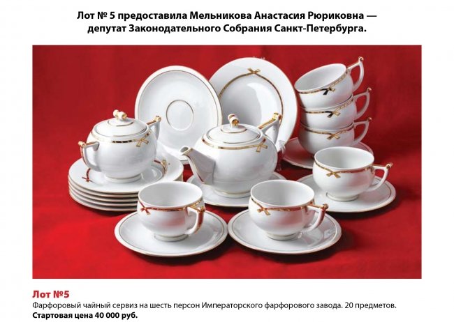 «Новой» удалось выяснить, что самыми заветными лотами оказались чайный сервиз Императорского фарфорового завода и боксерские перчатки Федора Емельяненко, в которых он отыграл победный бой с бразильцем Педро Хиззо в 2012 году. Посудный набор из 20 предметов выставила на торги актриса и депутат ЗакСа Анастасия Мельникова, перчатки – что неожиданно – Культурный центр Елены Образцовой. Экипировка ушла одному из присутствовавших на вечере бизнесменов более чем за 150 тысяч рублей, а начинала торговаться с пятидесяти. Сервиз Анастасии Мельниковой также ушел дороже, чем за сто тысяч, при стартовой цене в сорок. В целом же очевидцы жаловались, что увлекательного зрелища не получилось и повышение ставок было довольно скромным.