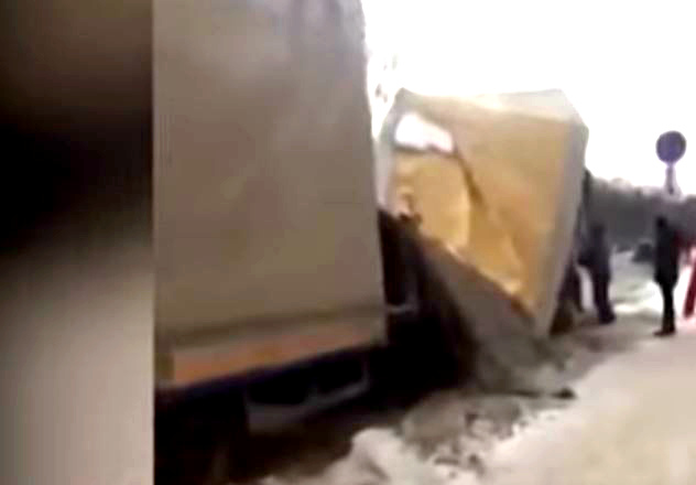В Кемерово очевидцы разместили в сети ролик, в котором видно, как огромная глыба льда сильно помяла грузовой автомобиль.