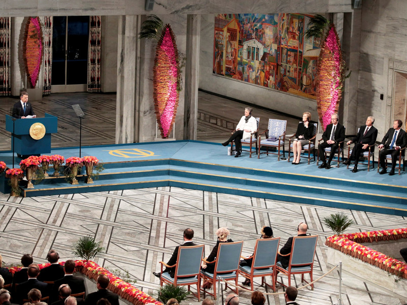 Первой вручена Нобелевская премия мира. Ее в этом году получил президент Колумбии Хуан Мануэль Сантос. Согласно последней воле знаменитого шведского химика Альфреда Нобеля, премия мира, в отличие от остальных наград, носящих его имя, присуждается и вручается в Осло, а не Стокгольме, напоминает ТАСС.