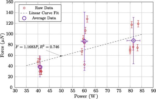 Собственно, из этой картинки видно, что все эти выводы — полная туфта, потому что разбросы экспериментальных точек слишком велики, и даже после усреднения по многим измерениям через прямоугольники погрешности вполне можно провести горизонтальную прямую. И даже прямую с отрицательным наклоном — так, будто наличие излучения уменьшает тягу, а не увеличивает.