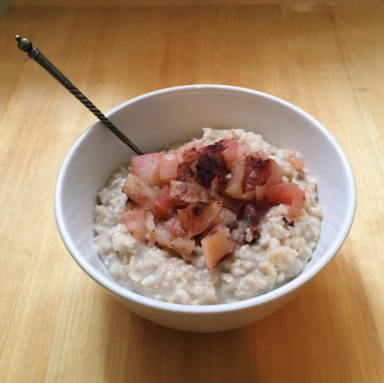 Если вы любите печеные яблоки, то это завтрак для вас: сварите овсянку (я люблю ту, которую нужно варить минут 15), порежьте кубиками на сковородку одно-два яблока, добавляете масла (лучше сливочного, но можно любое), посыпаете сверху корицей, накрываете крышкой и ставите на маленький огонь минут на 5-10. Если едите сахар, то посыпьте сразу сверху сахаром, если нет — добавите мед, когда все немного остынет. Я варю овсянку на воде, а потом добавляю кокосового молока, сверху кладу мягкие яблоки и поливаю ложкой меда, можно еще положить туда орехи. В такую погоду то, что нужно, учитывая, что яблоки можно каждые выходные везти с дачи или за очень небольшие деньги купить в любом магазине.
