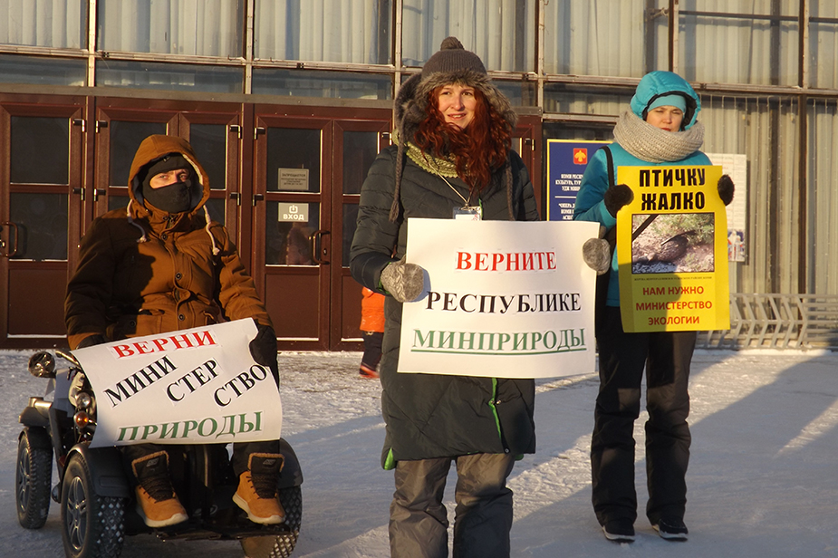 Воскресенье 11 декабря в Сыктывкаре было морозным и солнечным. В полдень возле театра оперы и балета республики на митинг против слияния министерства промышленности, природных ресурсов, энергетики и транспорта и министерства природных ресурсов и охраны окружающей среды собралось небольшое количество протестующих — всего, если считать и журналистов, около сорока человек. Некоторые участники акции быстро замерзли и ушли до ее окончания, некоторые явились позже. Несколько полицейских мерзли чуть поодаль. Вокруг гуляли родители с детьми. Дети изображали ангелов: падали на широкое заснеженное крыльцо театра, усердно водили по снегу руками и ногами и смеялись.