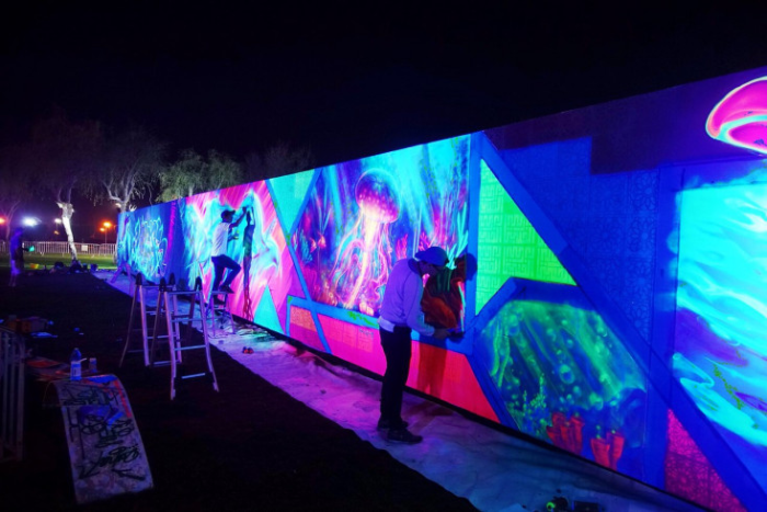 Всего в проекте приняли участие 28 авторов из России, Саудовской Аравии, Ливии, Швейцарии, Португалии и Кипра. Кроме петербуржца, Россию представлял художник из Екатеринбурга Антон Районов. Чтобы поставить рекорд, художники с баллончиками в руках рисовали картину пять ночей подряд. В качестве материала использовался люминесцентный краситель. В итоге полотно получилось общей площадью более 400 квадратных метров.