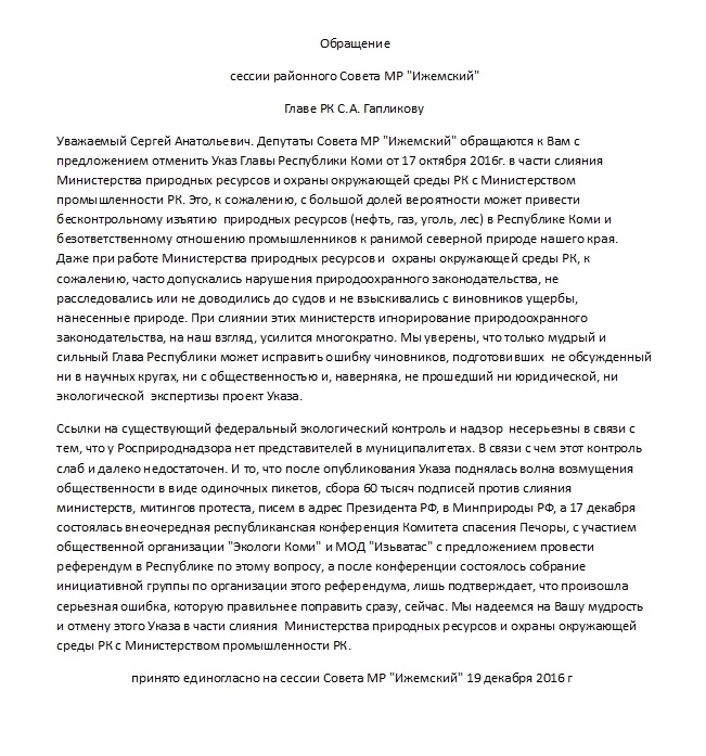 В обращении говорится о том, что последствия указа, подписанного Гапликовым два месяца назад, могут быть плачевными: «Это, к сожалению, с большой долей вероятности может привести к бесконтрольному изъятию природных ресурсов (нефть, газ, уголь, лес) в Республике Коми и безответственному отношению промышленников к ранимой северной природе нашего края».