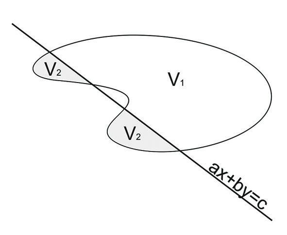 — a, b, c — это коэффициенты уравнения прямой, а еще есть V — площадь отсеченной части.