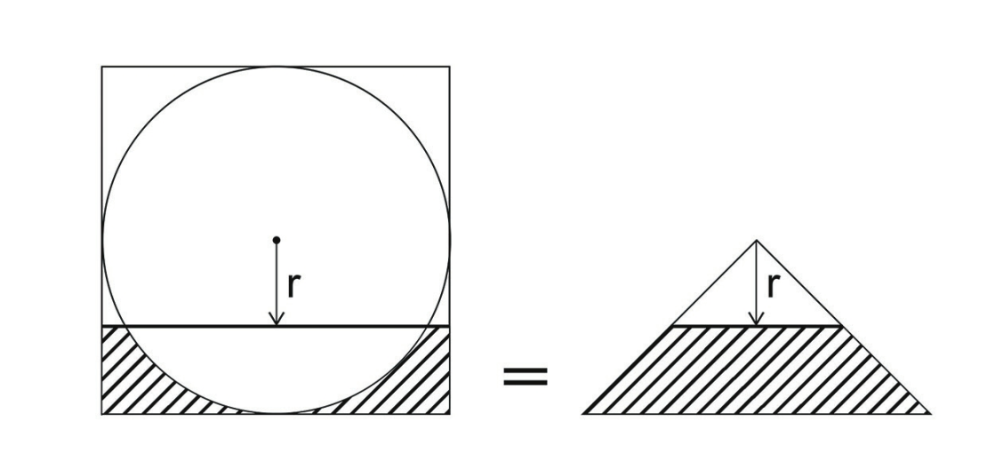 — Тогда утверждается, что объем части цилиндра, лежащей под плоскостью, равен сумме объема луночки и усеченного конуса.