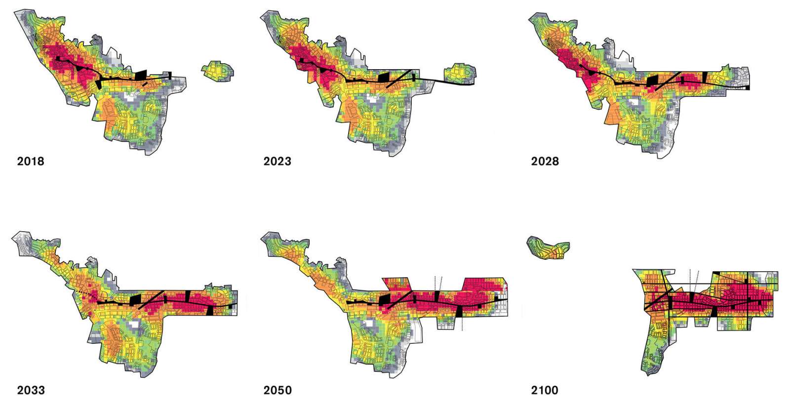 © white arkitekter Перемещение Кируны к 2033 году Реализация делится на шесть фаз, последняя из которых должна быть завершена в 2100 году. Если старый город живописно огибал подножие горы Кирунавара, новая Кируна имеет жесткую линейную структуру и должна развиваться вдоль улицы Мальмвэгэн, которая идет от старого города на восток и соединяет его с аэропортом и ближайшими поселками Ломболо и Туоллувара. На этот «урбанистический пояс» будут нанизаны основные общественные пространства нового города, вокруг которых расположатся ключевые здания.