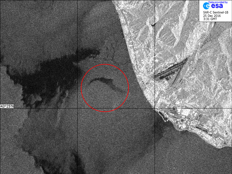 Тем временем Институт космических исследований РАН опубликовал радиолокационное изображение места крушения Ту-154. Оно было получено с помощью принадлежащего Европейскому космическому агентству (ESA) космического аппарата Sentinel-1B (радиолокационный спутник). Снимок был сделан в 6:31 по московскому времени. Напомним, что самолет пропал с радаров в 05:27 утра воскресенья, 25 декабря.
