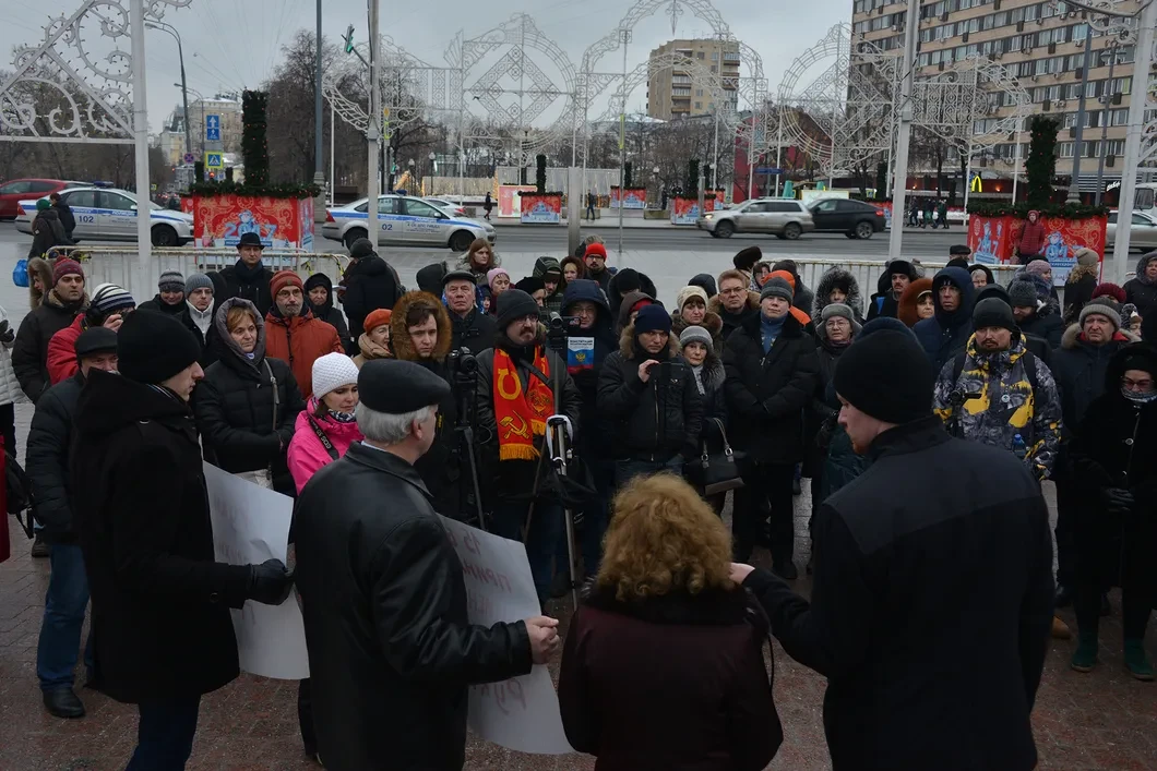 Несмотря на минусовую температуру, к двенадцати часам дня у памятника собралось несколько десятков человек: благообразного вида пожилые дамы, активисты независимого профсоюза, молодежь. Кроме того от КПРФ к подножью памятника пришло несколько ряженых активистов в фуражках красной армии, это делегаты от молодежного крыла компартии. Обратиться к коммунистам за помощью оказалось единственным способом провести несогласованное властями собрание.