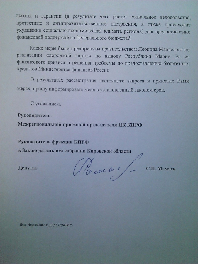 Руководитель межрегиональной приемной Председателя ЦК КПРФ Сергей Мамаев также просит разъяснить: какие меры были предприняты правительством Леонида Маркелова по реализации «дорожной карты» по выводу Республики Марий Эл из финансового кризиса и решения проблемы по предоставлению бюджетных кредитов Министерства финансов России.