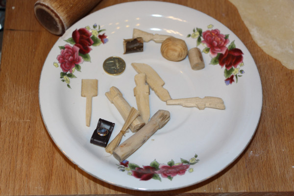 Вот лишь некоторые "сюрпризы", которые мы приготовили гостям. Посмотрим, что тут у нас. Десятикопеечная монета, кусочек кожаного ремешка от брелка, кусочек лыка от мочалки, небольшие стилизованные фигурки, вырезанные из дерева (вишни и яблони): ружья, ножи, лопаты, бараньи или телячьи ноги с копытами, пеньки, шарик. А что они означают - смотри ниже.