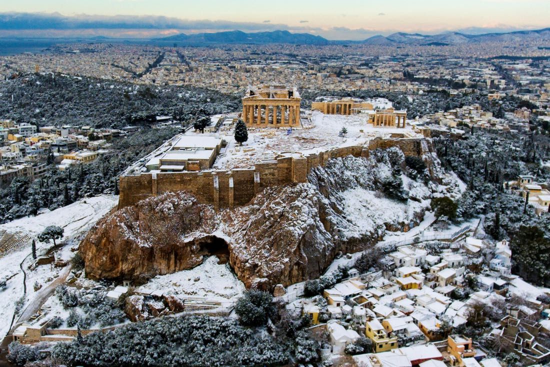 Но у непривычной для Афин погоды есть и положительная сторона: акрополь (и особенно Парфенон) в снегу выглядит сказочно.