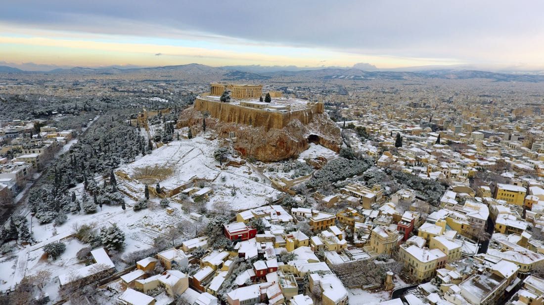 Смотрите, афинский акрополь в снегу