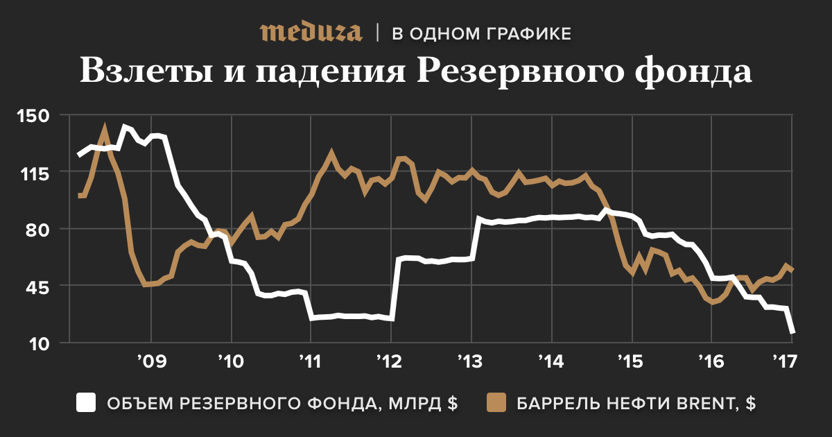 - Министерство финансов неоднократно предупреждало, что в 2017 году Резервный фонд будет исчерпан при сохранении низких цен на нефть. К концу 2016 года стоимость нефти выросла по сравнению с началом года.
