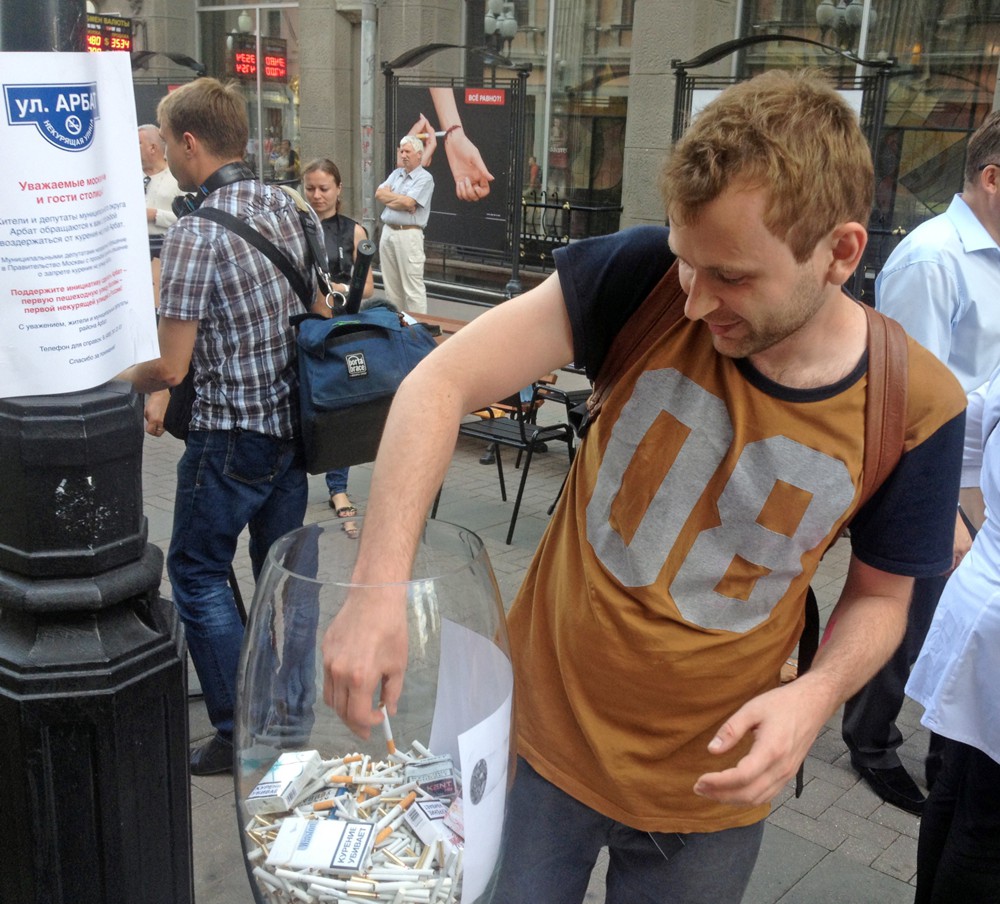 Открытие свободной от курения зоны на Старом Арбате АГН "Москва" Надо сказать, что в России было принято довольно хорошее законодательство по защите людей от табачного дыма. К сожалению, это законодательство до сих пор не реализовано. Если в общественных местах у нас запрещено курение и люди там уже фактически не курят, во всяком случае во многих общественных местах, то некоторые общественные места, а именно парки, подъезды – все те места, куда не дотягивается общественный контроль – продолжают оставаться закуренными и задымленными.