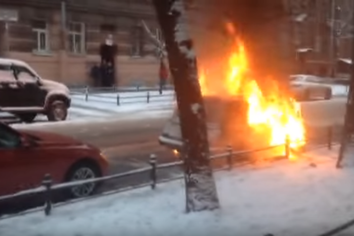 На Васильевском острове загорелась машина с людьми в салоне, сообщают очевидцы
