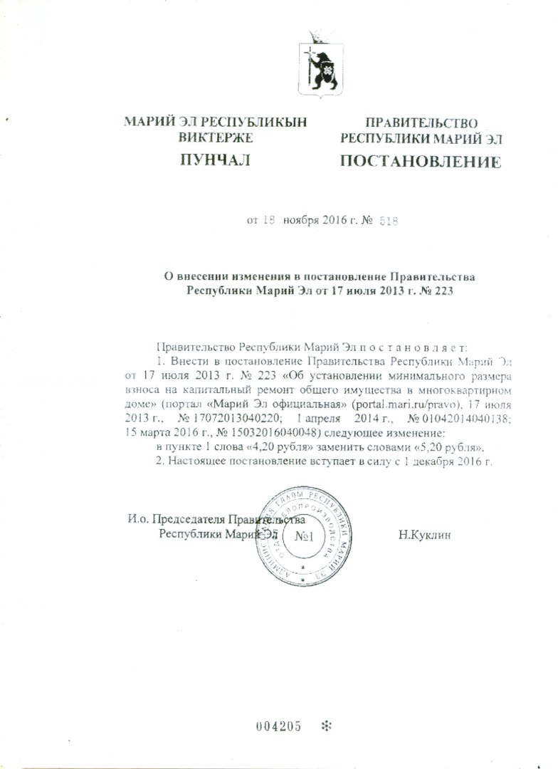 Вот и закончились Новогодние каникулы. С площадей наших городов исчезли метало-пластиковые Новогодние ёлки и световые гирлянды. Даже несколько взгрустнулось. Однако, как будто предчувствуя эту после новогоднюю хандру, Правительство Марий Эл заблаговременно позаботилось о том, чтобы наше Новогоднее настроение длилось чуть дольше обычного, подготовив для нас множество сюрпризов. Просто серпантин сюрпризов. И вот же что интересно: первый такой сюрприз был подготовлен ещё 18 ноября 2016 года. (Надо же!). А сюрприз этот заключается в Постановлении №518, подписанным и.о. Председателя Правительства господином Н. Куклиным. Гласит это Постановление ни много ни мало о ПОВЫШЕНИИ минимального размера взносов на капитальный ремонт!