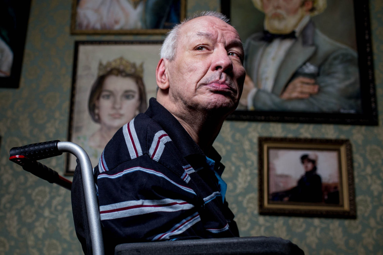 Александр Верейнов позирует на фоне стены своего рабочего кабинета. Все картины его кисти, кроме «Портрета незнакомки»Фото: Арсений Несходимов для ТД Саша Верейнов, а сейчас ему уже 60, всю жизнь прожил в инвалидной коляске. Ни ходить, ни обслуживать себя не может. Говорит с трудом — чтобы его понять, нужна тренировка. При посторонних он в основном молчит — стесняется. Зато со знакомыми, с теми, кто его давно знает, он охотно беседует. «Свои» — это в основном бывшие ученики его мамы, которая всю жизнь проработала в школе. Александры Александровны нет на свете уже несколько лет, а мальчишки и девчонки, которым тоже по 60 лет, два раза в год по-прежнему приходят в ее квартиру. Приходят на Новый год и на Сашин день рождения 25 июня — с гитарой, вином, вкусными штучками. Раньше приходили толпой, чуть ли не всем классом. Потом как-то постепенно многие отпали — ясное дело, семья, внуки, свои болячки и проблемы, и сейчас остался костяк — шесть человек, которые, наверное, будут теперь приходить всегда. Покуда живы.