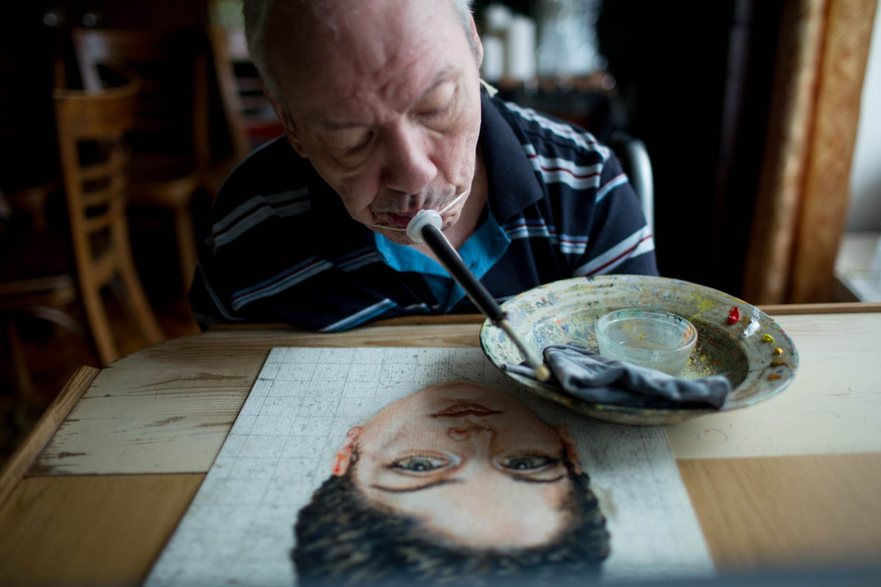 Инструменты Александра — кисть и кисть-ластик. Веревочки помогают закрепить инструменты на голове художника. Во время рисования Александр держит кисть зубамиФото: Арсений Несходимов для ТД Александра Александровна никогда не бывала за границей, но интуитивно выбрала европейский гуманный стиль отношений с болезнью сына. Она просто не дала болезни сломать ни ее, ни Сашу, выкатив против нее тяжелую артиллерию — материнскую любовь.