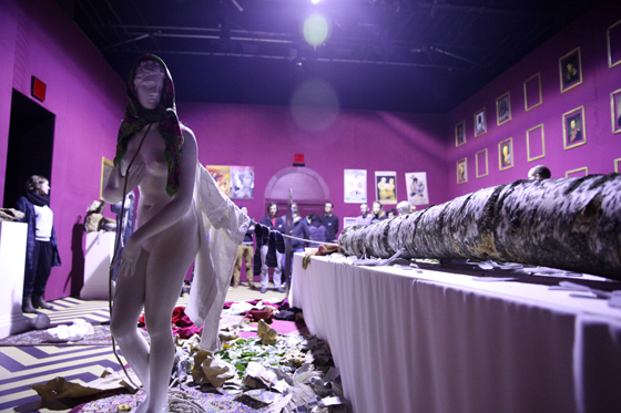 — Работалось легко и радостно. Поскольку не только смысловая сторона Eternal Russia, но и вся логистика, все необходимые перестановки, происходящие в пространстве по ходу дела, существовали поначалу только в моем сознании, мы работали следующим образом. Основные смысловые точки маршрута и параметры пространств (темная комната, заваленная мусором, дворцовый зал, рабочий клуб) задаются мной — а потом уже в обозначенных рамках Вера придумывает, что и как должно выглядеть. Скажем, мне нужна портретная галерея, и я понимаю, кто в ней должен присутствовать. А уж как развесить эти портреты, в каких рамках, какого размера, какого цвета будут стены — это решает Вера. Но при этом мы с ней постоянно находились и находимся в диалоге. Примерно так же мы работали и с композитором Владимиром Ранневым. Я ему говорила, что именно мне нужно выразить музыкой и как примерно я — абстрактно, естественно, — себе это представляю. Дальше Володя приносил мне те или иные варианты музыкальной реализации этой идеи, я слушала и говорила: вот здесь холодно, а здесь уже горячее. Но это вовсе не отменяло самостоятельности Веры и Володи. Просто в этом проекте все очень зависят друг от друга. От музыки Раннева, например, зависело то, как будет работать свет в главном пространстве и т.д. От длины моего текста — сколько времени есть на перестановку. Вообще это огромное счастье — работать с талантливыми людьми, которые готовы развить твою идею, тут же предложить свою, буквально на ходу найти выход из сложной ситуации (а таких ситуаций у нас был вагон и несколько маленьких тележек). Они уже, конечно, для меня — полноценные соавторы проекта.