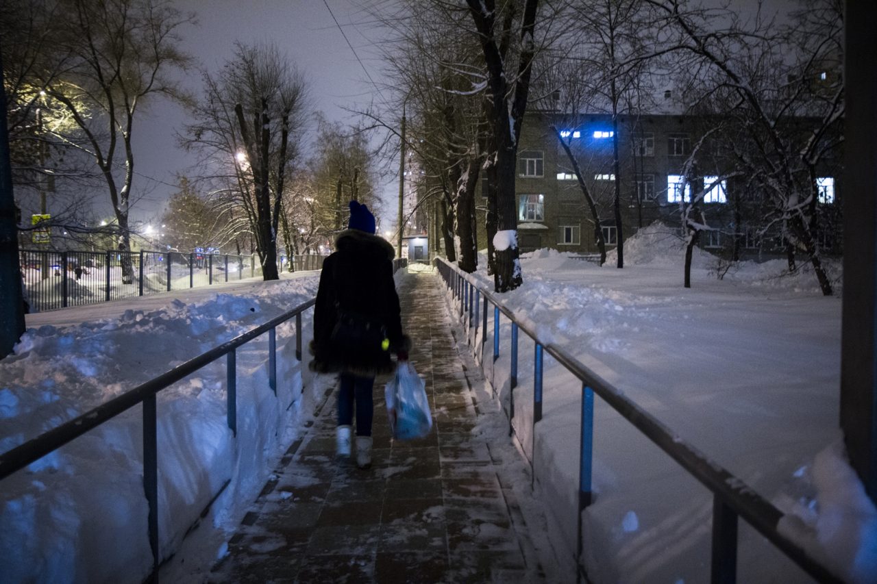 Обычно на остановку Ксюшу провожает мама: даже по привычной дороге идти в кромешной тьме девочке сложно. Сегодня вместо мамы я — крепко держу Ксюшу за руку, пока идем до остановки по заснеженной трассе.