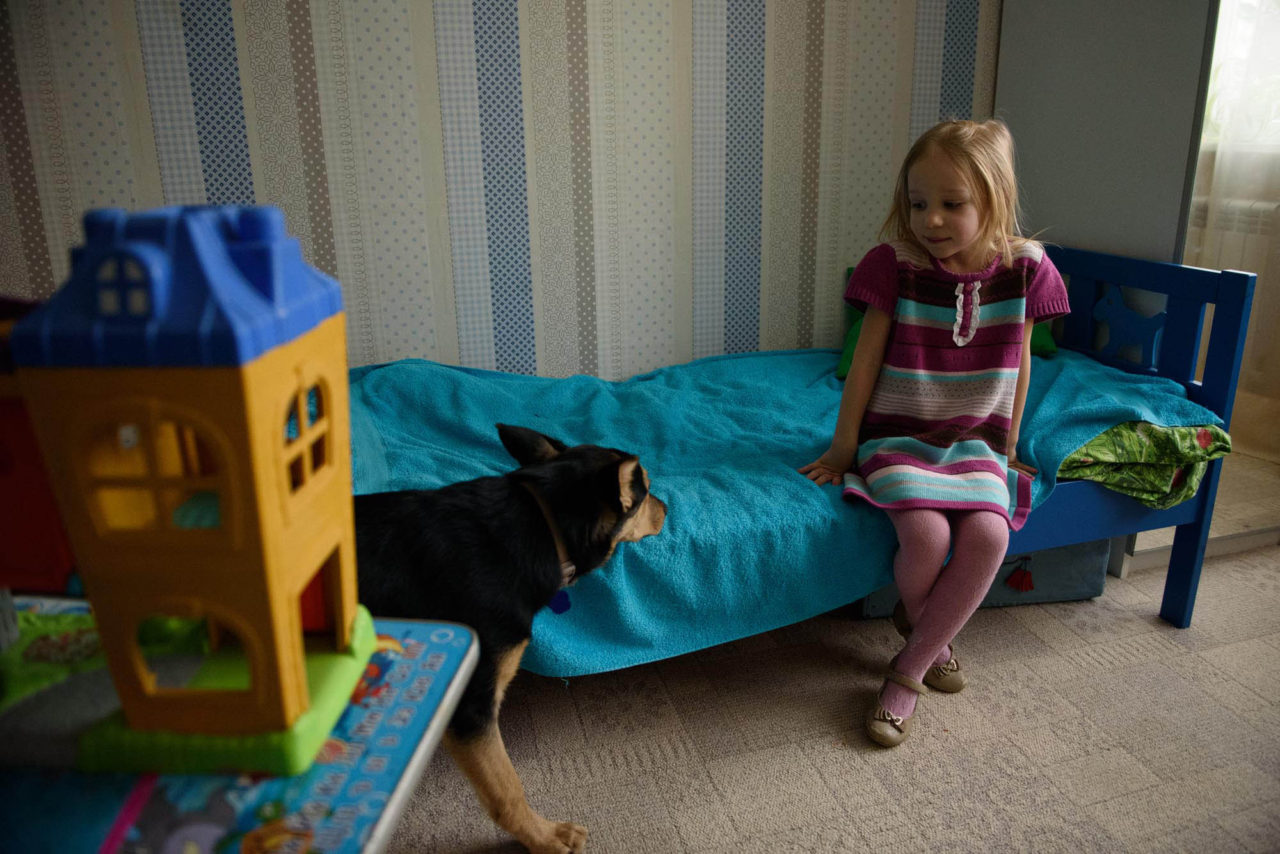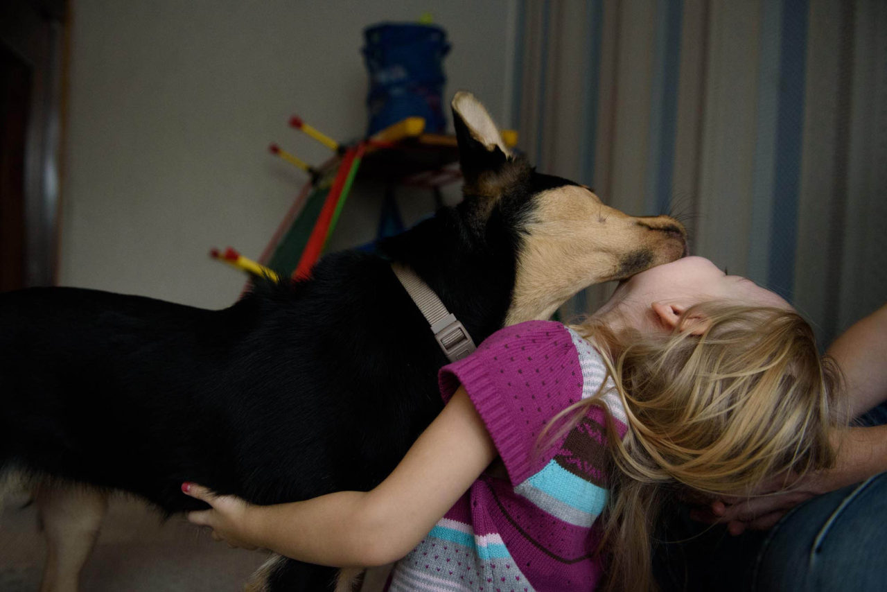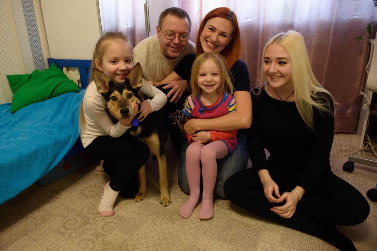 Клюква появилась в семье Комаровых незадолго до Нового Года. Как рассказывает мама Настя, это было новогоднее чудо, она редко заходит в соцсети, но в тот раз читала комментарии и наткнулась на историю Клюквы. Настя сразу поняла, что это их будущая собака. Муж Роман сначала не соглашался, но дети провели с ним воспитательную работу, и уже через неделю Клюква переехала к ним в квартиру. В семье Комаровых три девочки, и Клюква стала четвертой. Младшей Алисе четыре года, Тане восемь лет, Ульяне 17Фото: Евгений Иванов для ТД Конечно, терапевтом может стать не каждый пес. Это целый процесс проверки, отбора, тренировок и снова проверок, отбора, тренировок. Причем не только для собак. Далеко не каждый человек способен стать волонтером, ездить со своей собакой по хосписам, домам престарелых и детским учреждениям.