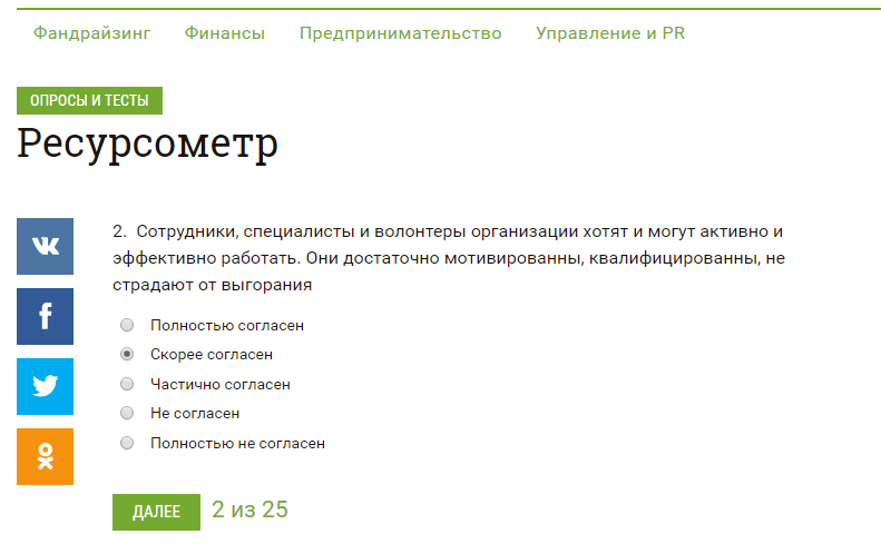 Кстати, на сайте «Кухня НКО» есть несколько познавательных тестов, которые помогут определить, правильно ли вы развиваетесь. Например, пройдя тест под названием «Довериометр», вы узнаете, обладает ли ваша организация должным уровнем доверия у доноров, спонсоров и сотрудников. А проанализировать ресурсы организации (человеческие, финансовые, материальные, информационно-технологические) можно с помощью теста «Ресурсометр».