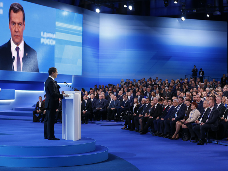 Премьер-министр Дмитрий Медведев выступил на съезде "Единой России", которую возглавляет. Он призвал не ждать скорой отмены санкций, велел навести порядок в ЖКХ и снизить число проверок бизнеса - лозунг, провозглашенный им еще в 2008 году, когда он сменил Владимира Путина на посту президента России. Сам Путин в этот раз на съезд не приехал, и Медведев зачитал от него письменное приветствие: глава государства назвал доверие граждан главным капиталом ЕР.