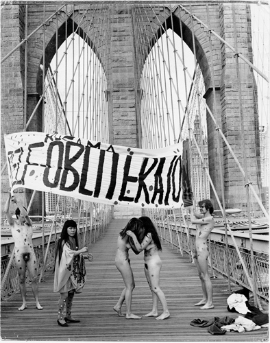 Антивоенная акция Яёй Кусамы с соавторами в 1968 году И для шведского художника Стуре Йоханессона было недостаточно закинуться кислотой и дышать психоактивным дымом («In the end we became too stoned», — шутил он (играя на двусмысленности глагола stone, который в форме страдательного залога может быть переведен как «находиться в состоянии наркотического опьянения», «быть побитым камнями, «быть обращенным в камень»). — Прим. пер.). Вместо этого, считал он, необходимо обратиться к обществу и сделать собственное социальное бытие цельным и ярким.