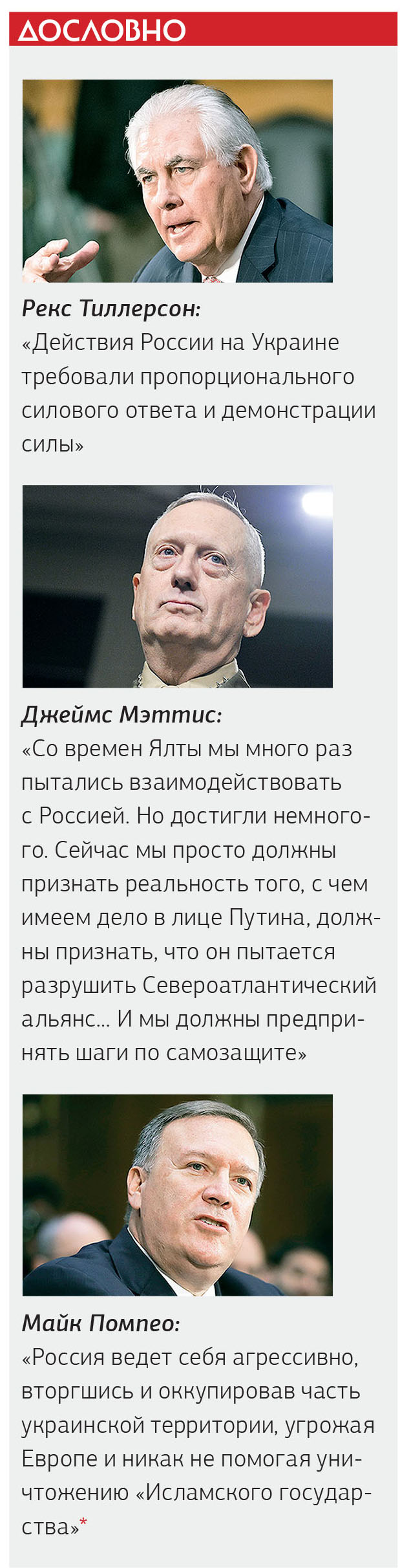 Новый шеф Пентагона Джеймс Мэттис откровенно признался, что действия Москвы вызывают у него «серьезную озабоченность», так как угрожают мировому порядку. Генерал также выразил уверенность, что именно Россия вместе с Ираном извлекла выгоду из хаоса гражданской войны в Сирии. Он не скрывал своего скептического отношения к перспективам сотрудничества с нашей страной в принципе: «Со времен Ялты мы много раз пытались взаимодействовать с Россией. Но достигли немногого. Сейчас мы просто должны признать реальность того, с чем имеем дело в лице Путина, должны признать, что он пытается разрушить Североатлантический альянс… И мы должны предпринять шаги по самозащите».