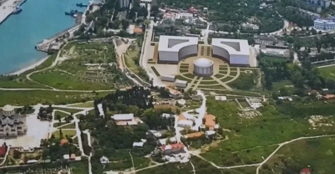 Источники «Новой» предоставили в распоряжение редакции планы РПЦ по застройке территории Херсонеса. На схеме, разработанной ООО «Проектный институт «Гражданспроект» действительно видно, что на месте существующего автобата ЧФ должен появиться музейный комплекс из трех зданий.