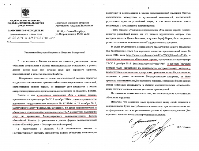 Кроме того, в ведомстве сообщили, что материалы «в рабочем (срочном) порядке были направлены на независимую автороведческую экспертизу компетентным специалистам, в результате проведения которой произведение, созданное в рамках исполнения государственного контракта, не было признано плагиатом». А в качестве моральной компенсации внизу добавлено: «Полагаем, что созданное вами произведение ввиду своей тематики и направленности будет востребовано и использовано как на федеральном, так и на региональном уровне».