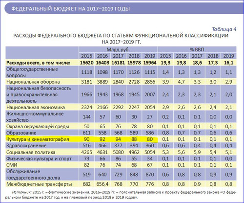 Как видим, еще в 2014 году планировали, что из федерального бюджета страны должны были выделить на раздел "Культура" в 2015 году 99 млрд. рублей, в 2016 - 100 млрд. руб., в 2017 - 89,4 млрд. руб. На самом деле, правда, вышло не так как планировали.