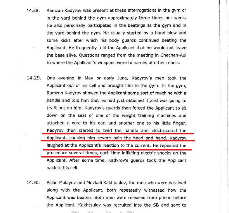 "В спортзале Рамзан Кадыров показал истцу какую-то машину с рукояткой и сообщил, что приобрел ее недавно и собирается испытать на нем. Охранники Кадырова посадили истца на один из тренажеров и прикрепили один конец провода к его уху, а другой – к пальцу. Затем Кадыров начал вращать рукоятку, истца ударило током. У него страшно заболела голова и рука, а Кадыров хохотал. Такую процедуру он повторил несколько раз…".