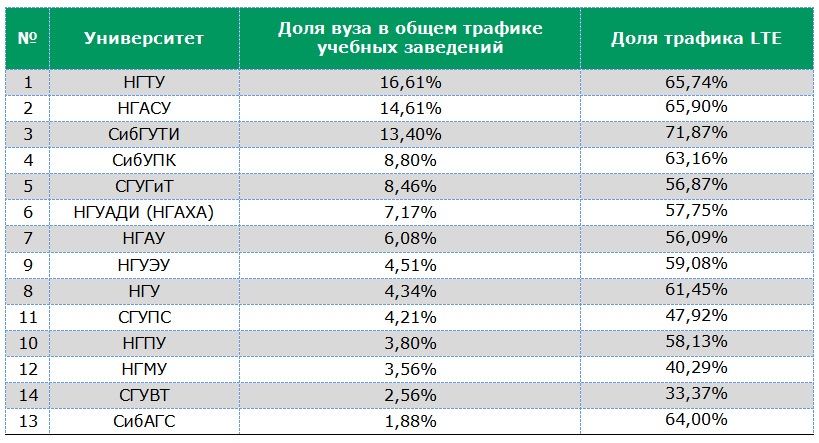Будущие связисты из Сибирского государственного университета телекоммуникаций и информатики (СибГУТИ) вывели свой вуз на третье место. Ежемесячно каждый из них тратит около 1ГБ мобильного трафика (14–15 песен и 43 фотографии в день), что составляет 13,40% от общего потребления мобильного интернета студентами в Новосибирске. Однако именно в этому университете учатся самые «продвинутые» студенты — доля 4G-трафика в СибГУТИ составляет рекордные 71,9%.