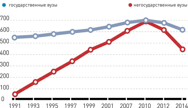 В России уже не первый год идет зачистка образовательного пространства. Университеты выстраиваются в строгую вертикаль, определяемую многими стандартами. Те, кто в нее не вписываются, выбывают из образовательного пространства: либо просто ликвидируются, либо с кем-то сливаются. Этот процесс приобрел заметные масштабы с 2013 г. В 2012 г. в России было 600 государственных вузов, а вместе с филиалами - около 2 тыс. заведений (РБК. 26.07.2012). В 2013 г. только в столице по результатам проверки был составлен список из 49 "неэффективных" вузов, а всего по стране в него попали 373 вуза и филиала. Дальше масштабы проверок и радикальность принимаемых мер только нарастали. Например, 1 января 2014 г. в России было 2486 вузов и филиалов, а на 4 марта 2016 года - 1450 (Интерфакс. 28.03.2016).