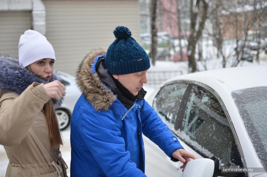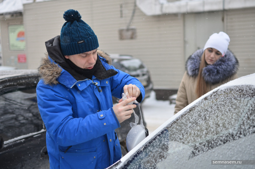 Антон Архипов разматывает скотч, которым он закрепил сломанное на своей машине зеркало. «Потом снова надо будет закрепить», — говорит он своей подруге Олесе Ветровой, которая в момент нападения была в автомобиле. Зеркало повисает на проводе, когда Антон убрал последний кусок скотча. «Они били кулаками в стекло. И по зеркалу тоже били — сверху вниз. Иначе бы оно так, как сейчас, не висело», — рассказывает Олеся. Примерная стоимость ремонта зеркала — около 15 тыс. рублей.