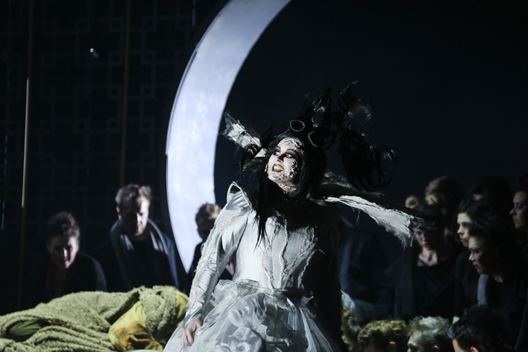 © Анна Молянова / Геликон-опера Канадская дизайнерша китайского происхождения Камелия Куу смешала дозированное количество экзотики из Поднебесной с новыми технологиями и огромной зловещей луной из триеровской «Меланхолии». Луна иногда превращается в крутящееся лезвие, светящиеся шары в руках, как всегда, активно танцующего геликоновского хора (хореограф — Эдвальд Смирнов) оттеняют общий темный колорит (мастер по свету — еще один импортный гость Томас Хазе), свои убийственные загадки Турандот выкрикивает сквозь три водопроводных люка. Идея понятна, но вообще с круглыми предметами на сцене некоторый перебор.