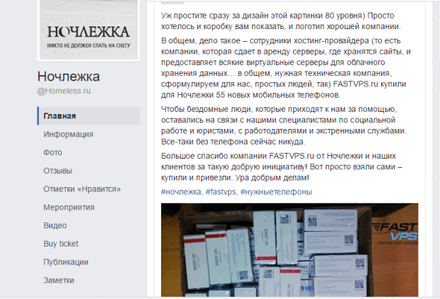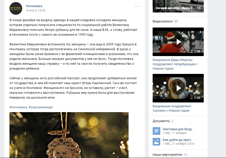 Например, в группах «Ночлежки» Влада Гасникова регулярно рассказывает о людях и компаниях, которые помогли организации.