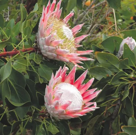 Впрочем, это «тридевятое царство» на поверку оказывается не таким уж заоблачно далеким: лицо Капского флористического царства создают родственники хорошо знакомых нам растений, таких, например, как вереск, пеларгония (комнатная герань) или кислица. Вот только виды вересков или кислиц в Южной Африке исчисляются сотнями, да и выглядят они весьма непривычно для европейского глаза. Много тут и кустарников с желтыми и лиловыми мотыльковыми цветками из семейства бобовых. Среди них — аспалатус линейный (Aspalathus linearis), из игольчатых листьев которого делают знаменитый чай ройбос. Немало в Капской провинции и представителей ирисовых, нередко с яркими и изящными цветками; среди них — дикорастущие гладиолусы, родоначальники культурных форм. Наконец, это протейные — предмет нашего исследовательского интереса.