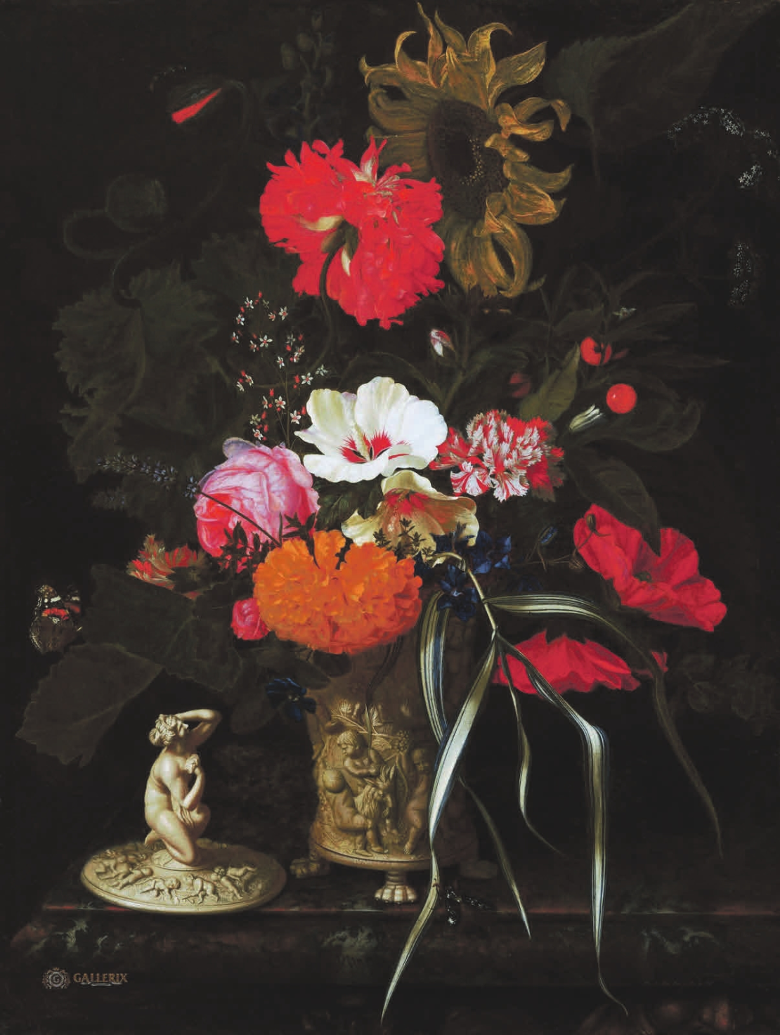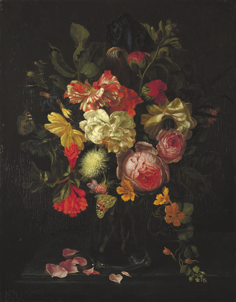 Напомним, что с натуры голландцы XVII века писали лишь малую часть своих «объектов»: обычно использовались как собственные заготовки, сделанные некогда в период цветения или плодоношения того или иного растения, так и гравюры и рисунки из известных ботанических атласов. Поэтому неудивительно, что в одном букете нередко соединены растения, цветущие ранней весной и, например, в августе.