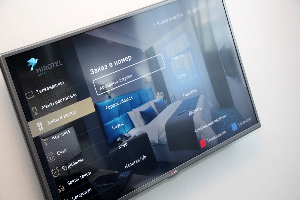 На прикроватных тумбочках с встроенными USB-выходами для подзарядки вместо стандартных туристических карт-путеводителей — «Мифосибирск» Игоря Маранина. Интерактивный телевизор напротив кровати позволяет постояльцу, например, сделать заказ в ресторане или управлять своим счетом. Меню интерфейса пока на русском и английском, но Швецов пообещал в ближайшее время добавить китайский, поскольку MIROTEL надеется стать Сhina friendly.