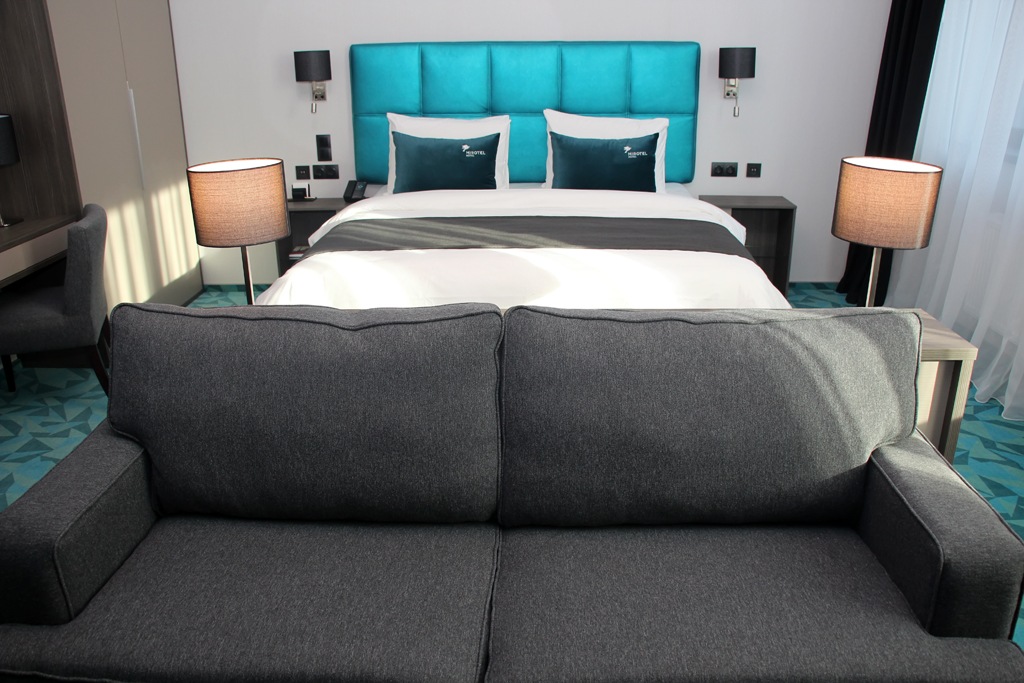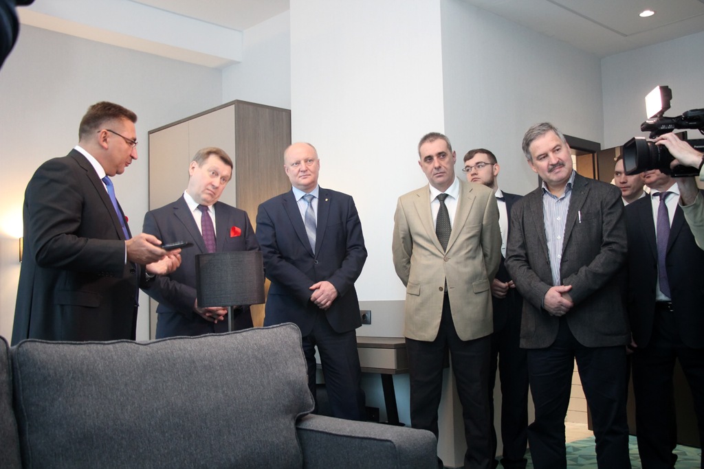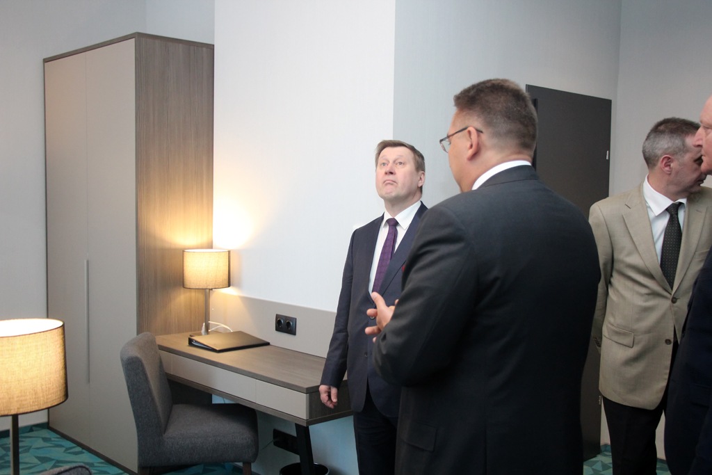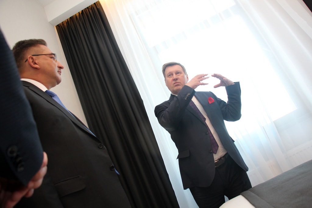 В первую очередь директор заговорил о звездах: четыре звезды отеля подтверждены сертификатом. «А на кроватях и белье мы и вовсе экономить не стали, они у нас на уровне пяти звезд, потому что главное для делового человека в гостинице — это сон, — рассказал Швецов, — а шторы, например, сделаны из такого материала, что ими можно очаги возгорания накрывать».