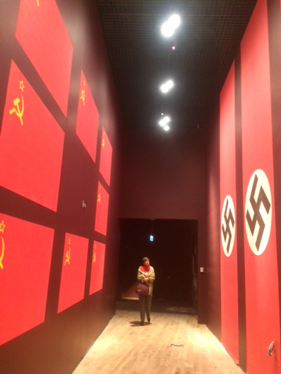 При этом польское ведро и так перевешивало европейское на этом воображаемом коромысле. Конечно, имея такую географию и такую историю, как у Польши, невозможно избежать соблазна и не сделать узенький зал-коридор, одну стенку которого украшают нарисованные знамена со свастиками, а другую — с серпами и молотами. Но, виктимизируя Польшу, авторы экспозиции не забывали и о польской вине и ответственности: показаны еврейские погромы и в Едвабне (при немцах, но без немцев), и в Кельце (после войны, понятно, что без немцев).