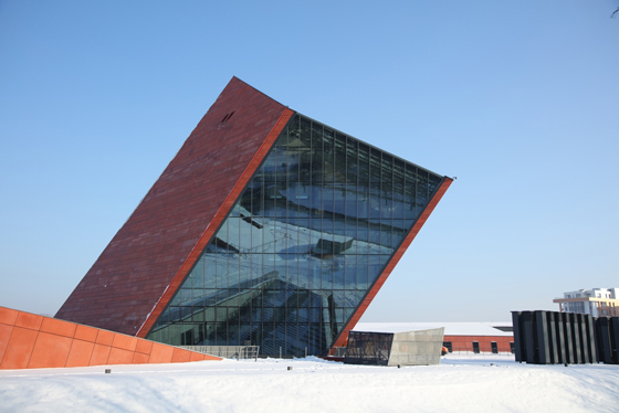 © Павел Полян И вот уже все позади: ублажены археологи, осушен котлован, выстроено и подключено к коммуникациям здание, выпущены для будущих посетителей десятки новых книг, помещены на первый этаж экспозиции два танка — советский и немецкий. Снаружи здание напоминает неразорвавшуюся бомбу, вошедшую в землю под углом градусов так в 45. А еще и рубку подлодки, тем более что рядом длинный горизонтальный корпус-палуба — служебные помещения музея. На местности же это скорее сложный многогранник, неправильный тетраэдр, более всего напоминающий главный кристалл из гипсовой друзы: две грани — стеклянные, две другие облицованы плиткой кирпичного цвета, что резко контрастирует с окружающей на некотором отдалении застройкой — серой во всех смыслах этого слова. Силуэт выразительный, и недаром уже в ходу сравнения здания с собором — храмом истории.